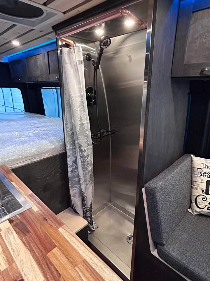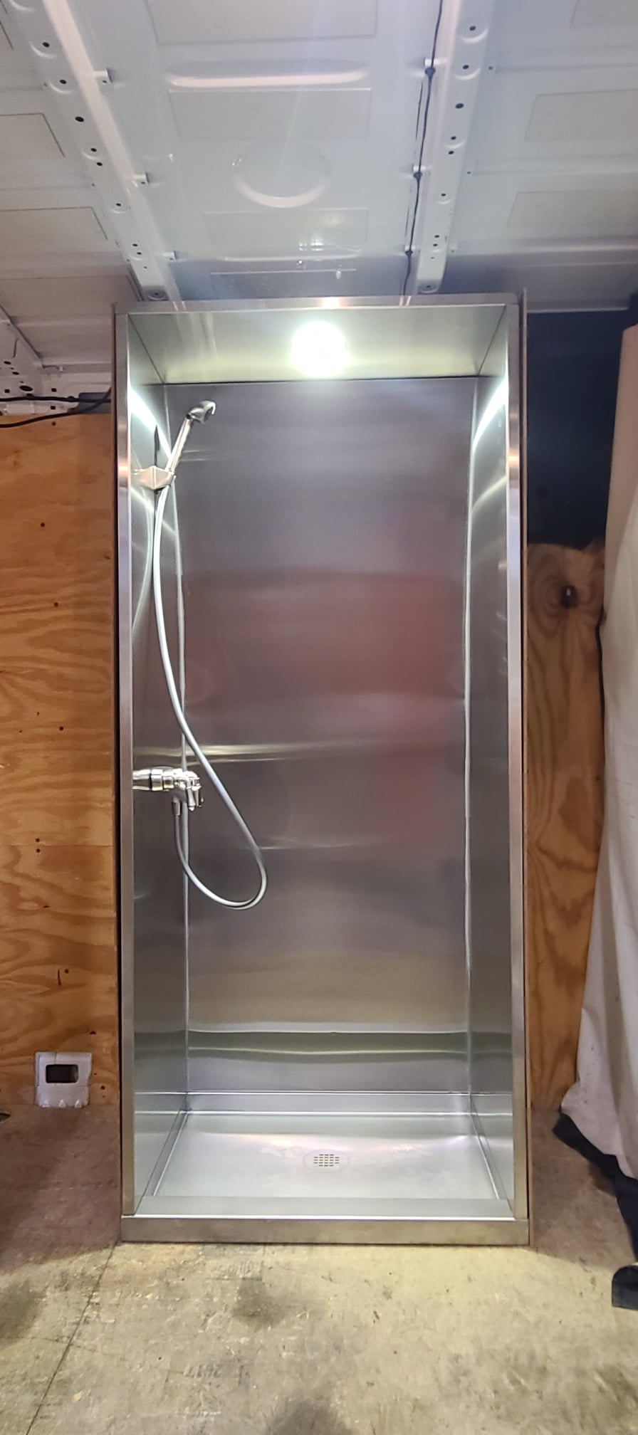 Frigo designs and builds Stainless Steel Showers and Shower Bases for all types of builds, including but not limited to Sprinter, Transit, Promaster Vans, R.V.’s, Buses, and Tiny Homes.